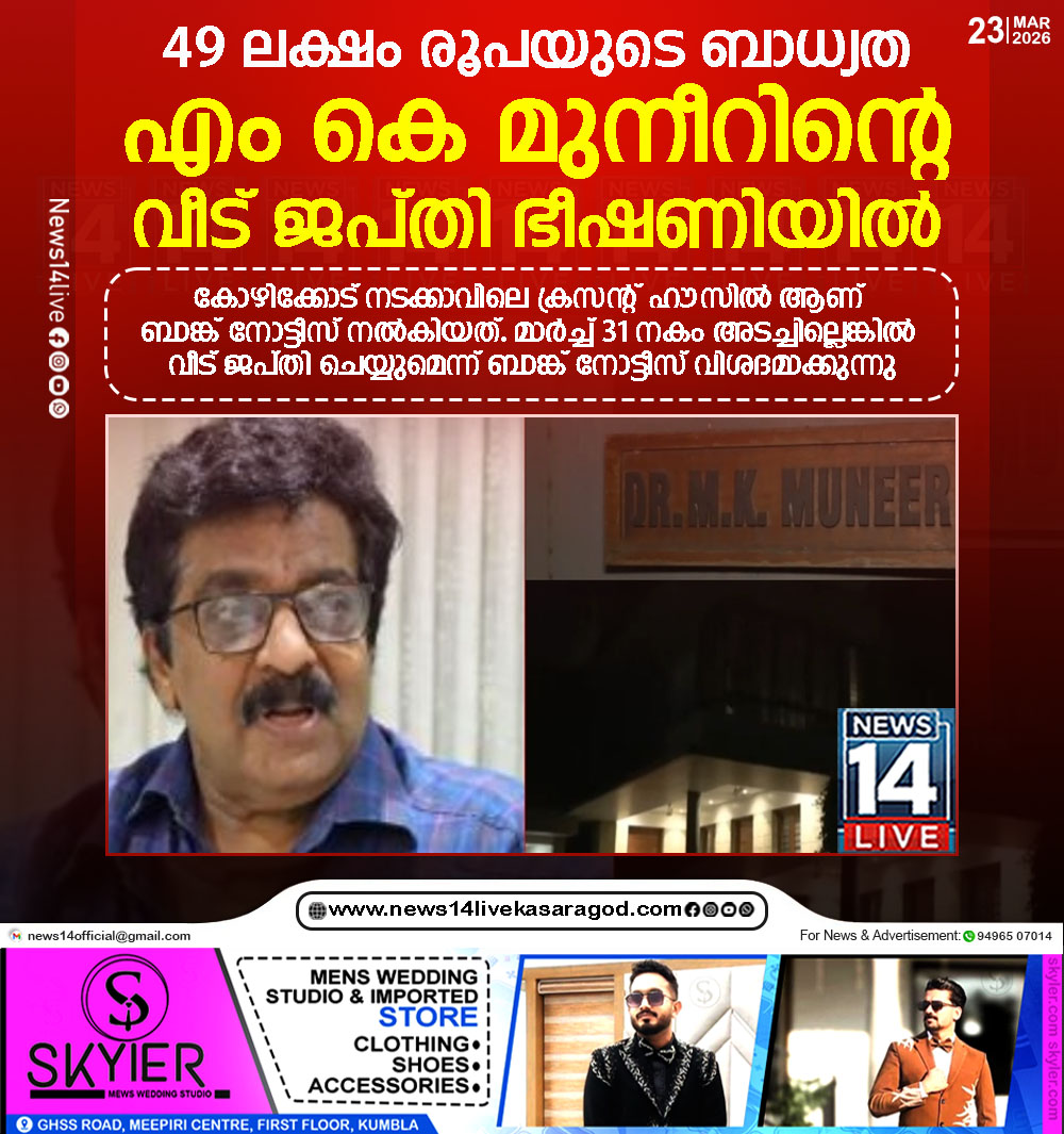 മുസ്ലിം ലീഗ് നേതാവും മുന് മന്ത്രിയും എംഎല്എയുമായ എം.കെ മുനീറിന്റെ വീട് ജപ്തി ഭീഷണിയില്. കാലിക്കറ്റ് ടൗണ് സര്വ്വീസ് സഹകരണ ബാങ്കില് കുടിശ്ശിക സഹിതം 49 ലക്ഷം…