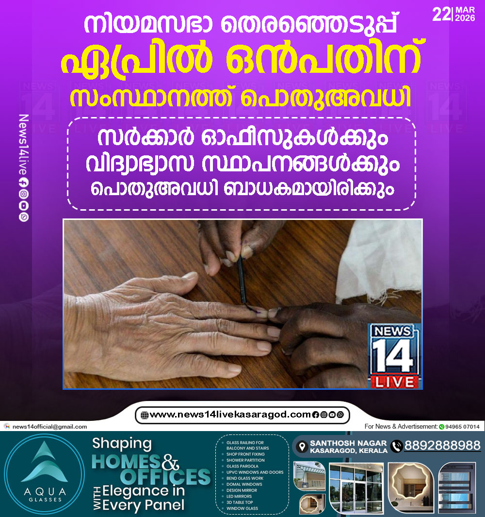 തിരുവനന്തപുരം: നിയമസഭാ തെരഞ്ഞെടുപ്പ് നടക്കുന്ന ഏപ്രില് ഒന്പതിന് സംസ്ഥാനത്ത് പൊതുഅവധി പ്രഖ്യാപിച്ചു. സര്ക്കാര് ഓഫീസുകള്ക്കും വിദ്യാഭ്യാസ സ്ഥാപനങ്ങള്ക്കും പൊതുഅവധി ബാധകമായിരിക്കും. നെഗോഷ്യബിള് ഇന്സ്ട്രുമെന്റ് ആക്ടിന്റെ പരിധിയില് വരുന്ന…