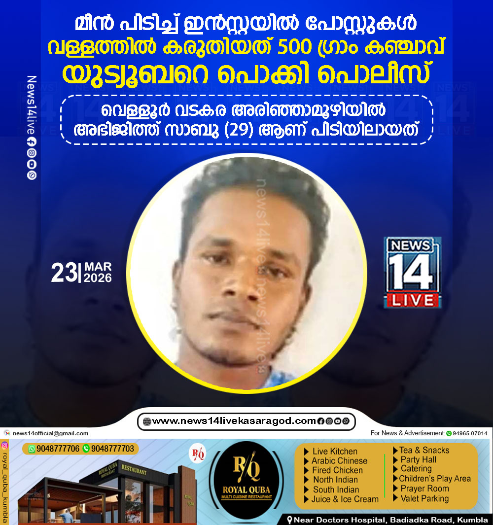 കോട്ടയം: ചെറിയ വള്ളത്തില് സൂക്ഷിച്ചിരുന്ന 580 ഗ്രാം കഞ്ചാവുമായി യുട്യൂബര് പിടിയില്. വെള്ളൂര് വടകര അരിഞ്ഞാമൂഴിയില് അഭിജിത്ത് സാബു (29) ആണ് പിടിയിലായത്. ജില്ലാ പൊലീസ് മേധാവിക്ക്…