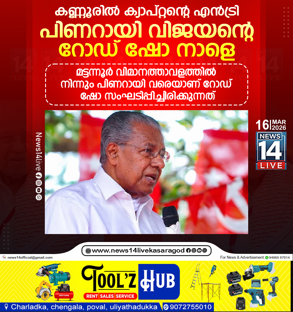 കണ്ണൂര്: മുഖ്യമന്ത്രി പിണറായി വിജയന്റെ റോഡ് ഷോ നാളെ കണ്ണൂരില്. മട്ടന്നൂര് വിമാനത്താവളത്തില് നിന്നും പിണറായി വരെയാണ് റോഡ് ഷോ സംഘടിപ്പിച്ചിരിക്കുന്നത്. ടി കെ ഗോവിന്ദന്റെ മരുമകള്…