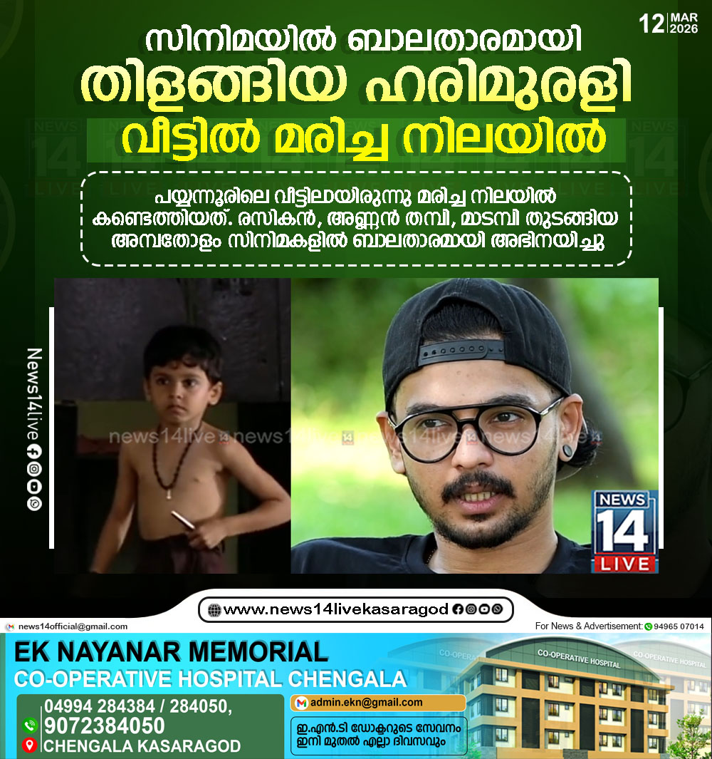 കൊച്ചി: സിനിമയില് ബാലതാരമായി തിളങ്ങിയ ഹരിമുരളിയെ വീട്ടില് മരിച്ച നിലയില് കണ്ടെത്തി. പയ്യന്നൂരിലെ വീട്ടിലായിരുന്നു മരിച്ച നിലയില് കണ്ടെത്തിയത്. രസികന്, അണ്ണന് തമ്പി, മാടമ്പി തുടങ്ങിയ അമ്പതോളം…