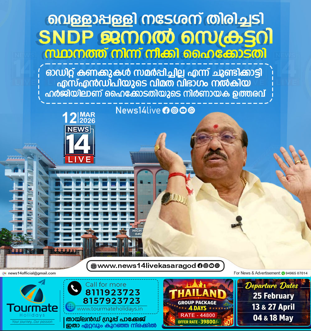 കൊച്ചി: വെള്ളാപ്പള്ളി നടേശന് ഹൈക്കോടതിയില് നിന്ന് തിരിച്ചടി. എസ്എന്ഡിപി ജനറല് സെക്രട്ടറി സ്ഥാനത്തുനിന്ന് വെള്ളാപ്പള്ളി നടേശനെ ഹൈക്കോടതി നീക്കി. വൈസ് പ്രസിഡന്റ് സ്ഥാനത്ത് നിന്ന് തുഷാര് വെള്ളാപ്പള്ളിയെയും…