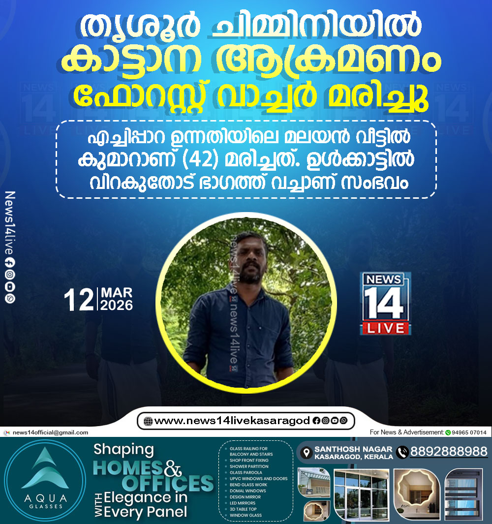 തൃശൂര്: ചിമ്മിനി വനത്തില് കാട്ടാന ആക്രമണത്തില് ഫോറസ്റ്റ് വാച്ചര് മരിച്ചു. എച്ചിപ്പാറ ഉന്നതിയിലെ മലയന് വീട്ടില് കുമാറാണ് (42) മരിച്ചത്. ഉള്ക്കാട്ടില് വിറകുതോട് ഭാഗത്ത് വച്ചാണ് സംഭവം.…