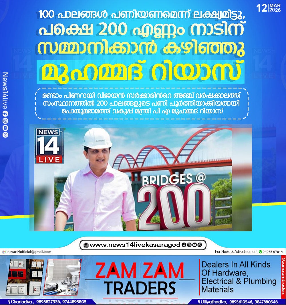 തിരുവനന്തപുരം: രണ്ടാം പിണറായി വിജയന് സര്ക്കാരിന്റെ അഞ്ച് വര്ഷക്കാലത്ത് സംസ്ഥാനത്തില് 200 പാലങ്ങളുടെ പണി പൂര്ത്തിയാക്കിയതായി പൊതുമരാമത്ത് വകുപ്പ് മന്ത്രി പി എ മുഹമ്മദ് റിയാസ്. എല്ഡിഎഫ്…