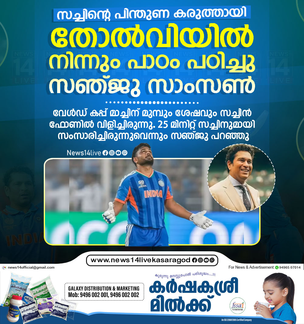 തിരുവനന്തപുരം: വീഴ്ചയില് പതറിയപ്പോള് സച്ചിന് ടെന്ഡുല്ക്കര് നല്കിയത് വലിയ പിന്തുന്നയാണെന്ന് ടി20 ലോകകപ്പ് നേടിയതിന് പിന്നാലെ നാട്ടിലെത്തിയ സഞ്ജു സാംസണ്. സച്ചിന്റെ പിന്തുണ കരുത്തായി. വേള്ഡ് കപ്പ്…