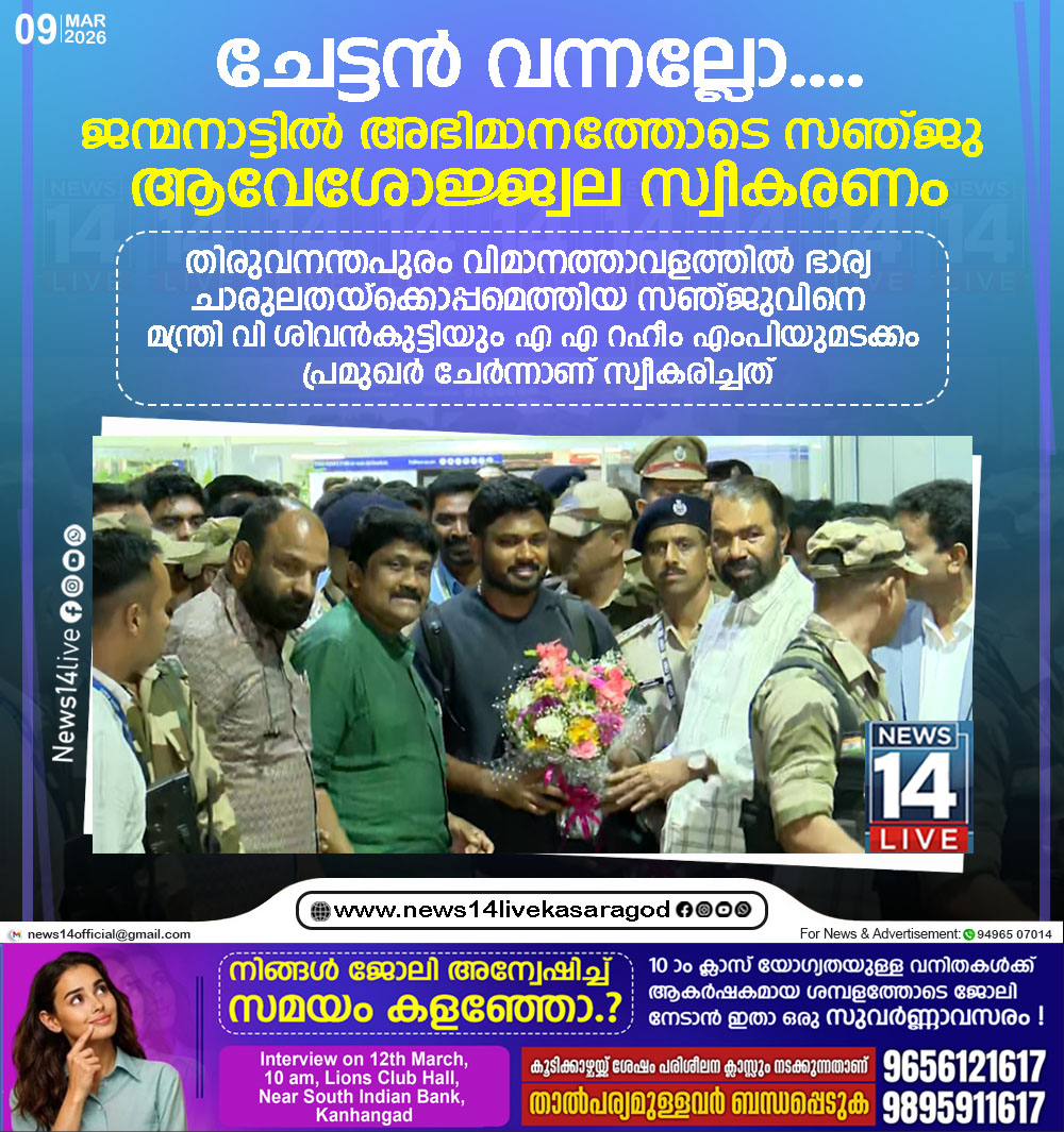 തിരുവനന്തപുരം: ടി20 ലോകകപ്പ് 2026 മത്സരത്തിലെ ഇന്ത്യന് ടീമിന്റെ വിജയത്തിലെ മിന്നും പ്രകടനത്തിന് പിന്നാലെ ജന്മനാട്ടിലെത്തി മലയാളികളുടെ അഭിമാനതാരം സഞ്ജു സാംസണ്. തിരുവനന്തപുരം വിമാനത്താവളത്തില് ഭാര്യ ചാരുലതയ്ക്കൊപ്പമെത്തിയ…