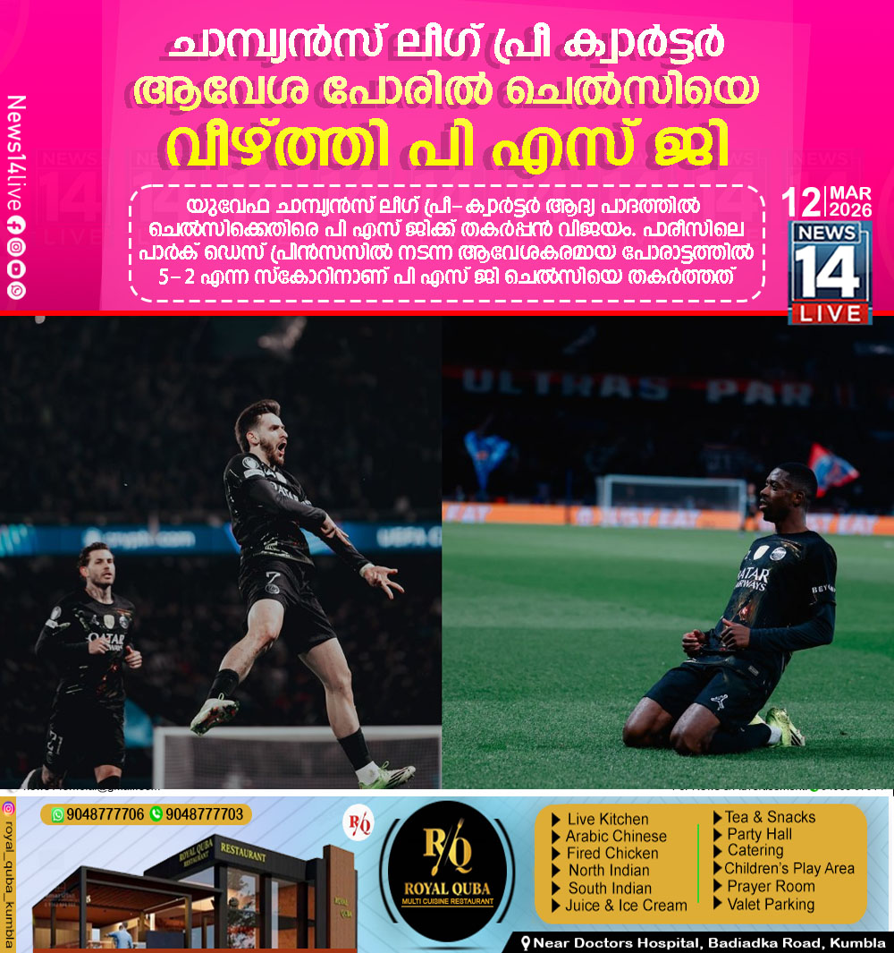 യുവേഫ ചാമ്പ്യന്സ് ലീഗ് പ്രീ-ക്വാര്ട്ടര് ആദ്യ പാദത്തില് ചെല്സിക്കെതിരെ പി എസ് ജിക്ക് തകര്പ്പന് വിജയം. പാരീസിലെ പാര്ക് ഡെസ് പ്രിന്സസില് നടന്ന ആവേശകരമായ പോരാട്ടത്തില് 5-2…