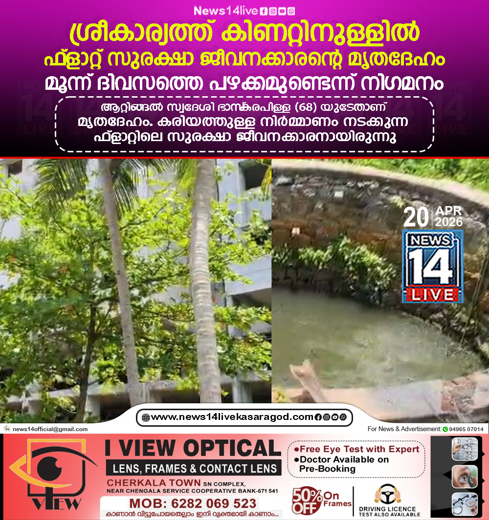തിരുവനന്തപുരം: ശ്രീകാര്യം കരിയത്ത് കിണറ്റിനുള്ളില് പുരുഷന്റെ മൃതദേഹം. ആറ്റിങ്ങല് സ്വദേശി ഭാസ്കരപിള്ള (68) യുടേതാണ് മൃതദേഹം. കരിയത്തുള്ള നിര്മ്മാണം നടക്കുന്ന ഫ്ളാറ്റിലെ സുരക്ഷാ ജീവനക്കാരനായിരുന്നു.മൃതദേഹത്തിന് മൂന്നു ദിവസത്തെ…