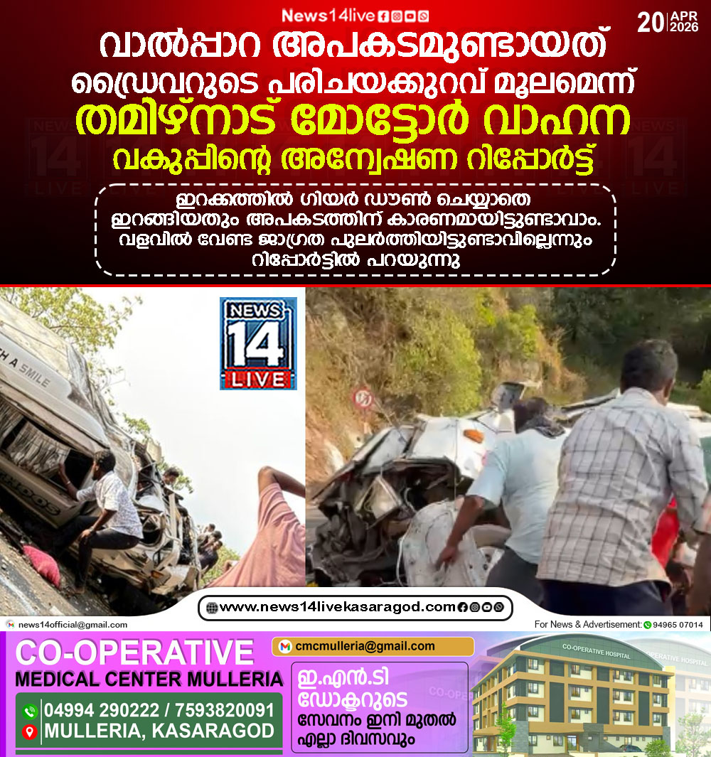 മലപ്പുറം: വാല്പ്പാറയില് ഒമ്പത് മലയാളികളുടെ മരണത്തിനിടയാക്കിയ അപകടമുണ്ടായത്ഡ്രൈവറുടെ പരിചയക്കുറവ് മൂലമെന്ന് തമിഴ്നാട് മോട്ടോര് വാഹന വകുപ്പിന്റെ അന്വേഷണ റിപ്പോര്ട്ട്. ഇറക്കത്തില് ഗിയര് ഡൗണ് ചെയ്യാതെ ഇറങ്ങിയതും അപകടത്തിന്…