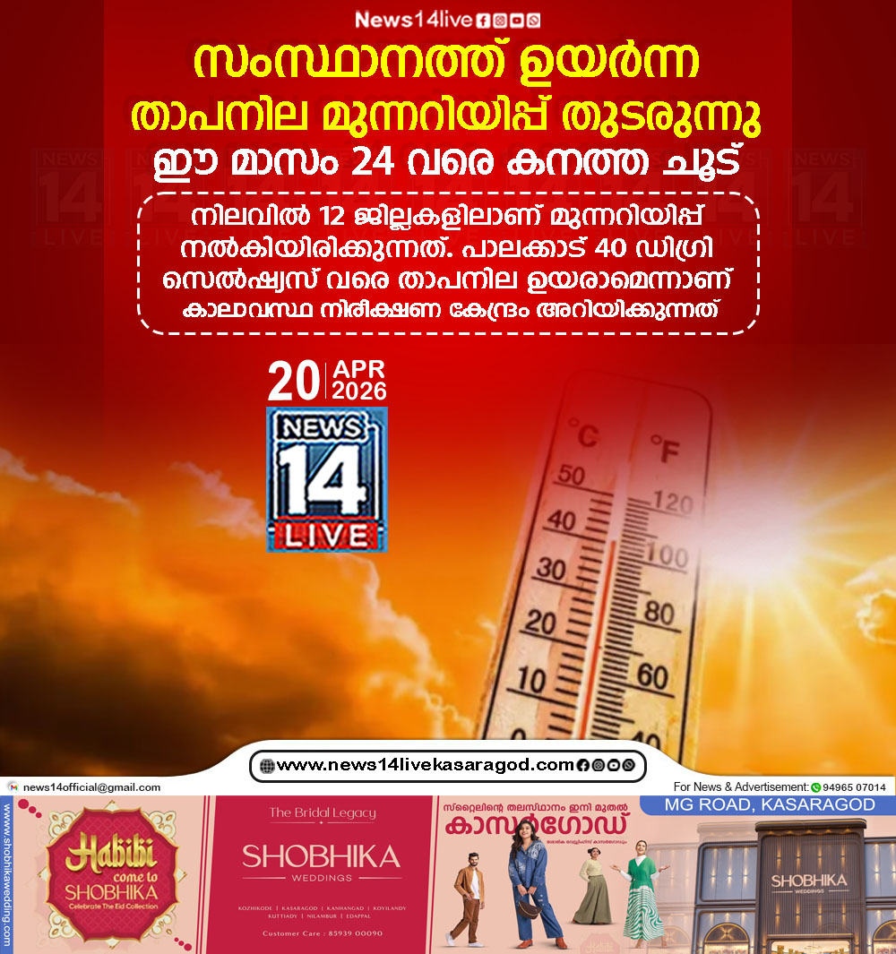 തിരുവനന്തപുരം: സംസ്ഥാനത്ത് ഉയര്ന്ന താപനില മുന്നറിയിപ്പ് തുടരുന്നു. നിലവില് 12 ജില്ലകളിലാണ് മുന്നറിയിപ്പ് നല്കിയിരിക്കുന്നത്. പാലക്കാട് 40 ഡിഗ്രി സെല്ഷ്യസ് വരെ താപനില ഉയരാമെന്നാണ് കാലാവസ്ഥ നിരീക്ഷണ…