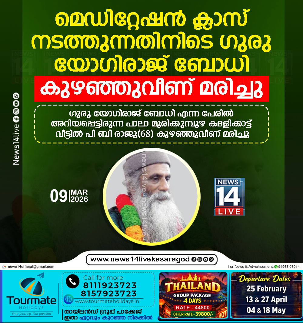 തൊടുപുഴ: ഗുരു യോഗിരാജ് ബോധി എന്ന പേരില് അറിയപ്പെട്ടിരുന്ന പാലാ മുരിക്കുമ്പുഴ കദളിക്കാട്ട് വീട്ടില് പി ബി രാജു(68) കുഴഞ്ഞുവീണ് മരിച്ചു. മെഡിറ്റേഷന് ക്ലാസ് നടത്തുന്നതിനിടെ കുഴഞ്ഞുവീണ്…