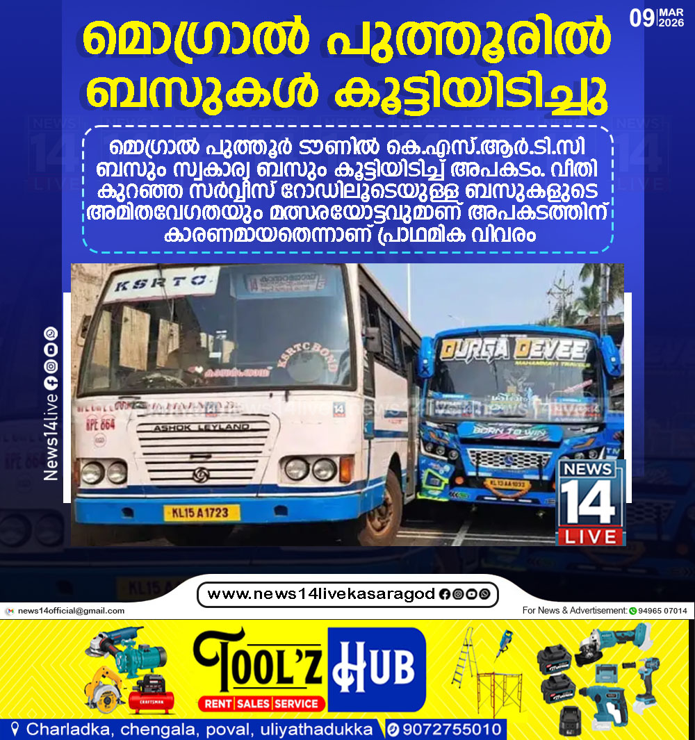 മൊഗ്രാല് പുത്തൂര് ടൗണില് കെ.എസ്.ആര്.ടി.സി ബസും സ്വകാര്യ ബസും കൂട്ടിയിടിച്ച് അപകടം. വീതി കുറഞ്ഞ സര്വ്വീസ് റോഡിലൂടെയുള്ള ബസുകളുടെ അമിതവേഗതയും മത്സരയോട്ടവുമാണ് അപകടത്തിന് കാരണമായതെന്നാണ് പ്രാഥമിക വിവരം.…