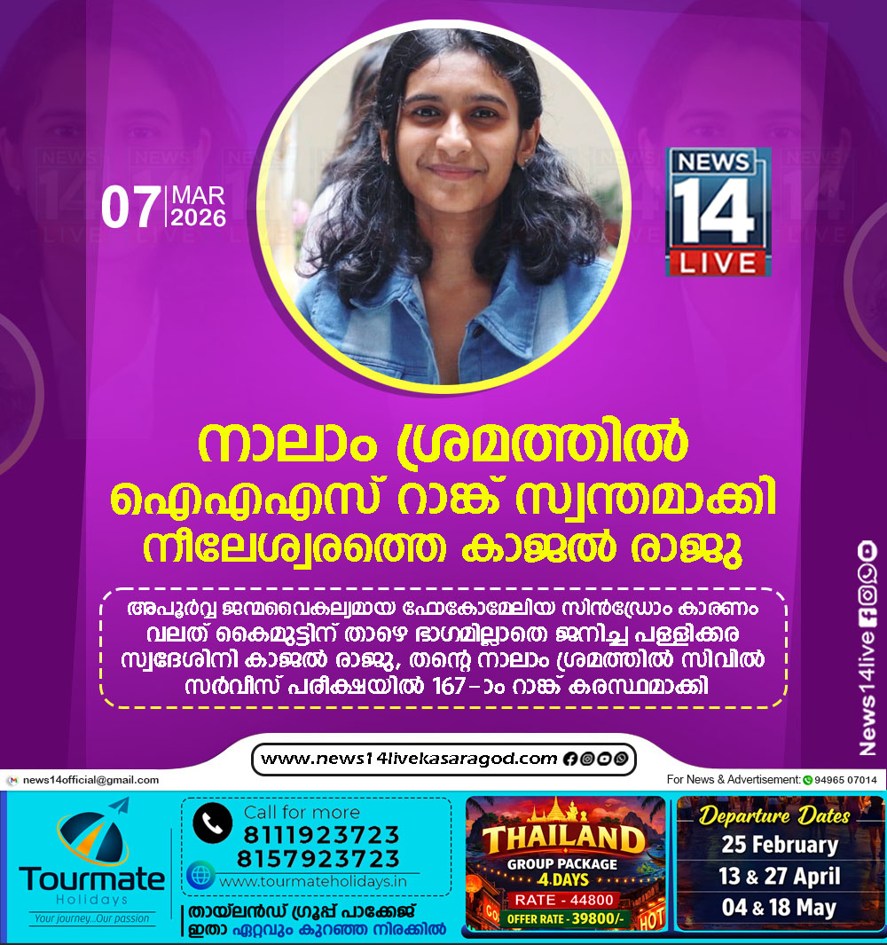 നീലേശ്വരം: പരിമിതികളെ മനക്കരുത്തുകൊണ്ട് കീഴടക്കി നീലേശ്വരത്തിന്റെ പെണ്കരുത്ത് രാജ്യത്തിന്റെ ഔദ്യോഗിക ഭരണകൂടത്തിലേക്ക്. അപൂര്വ്വ ജന്മവൈകല്യമായ ഫോകോമേലിയ സിന്ഡ്രോം കാരണം വലത് കൈമുട്ടിന് താഴെ ഭാഗമില്ലാതെ ജനിച്ച പള്ളിക്കര…