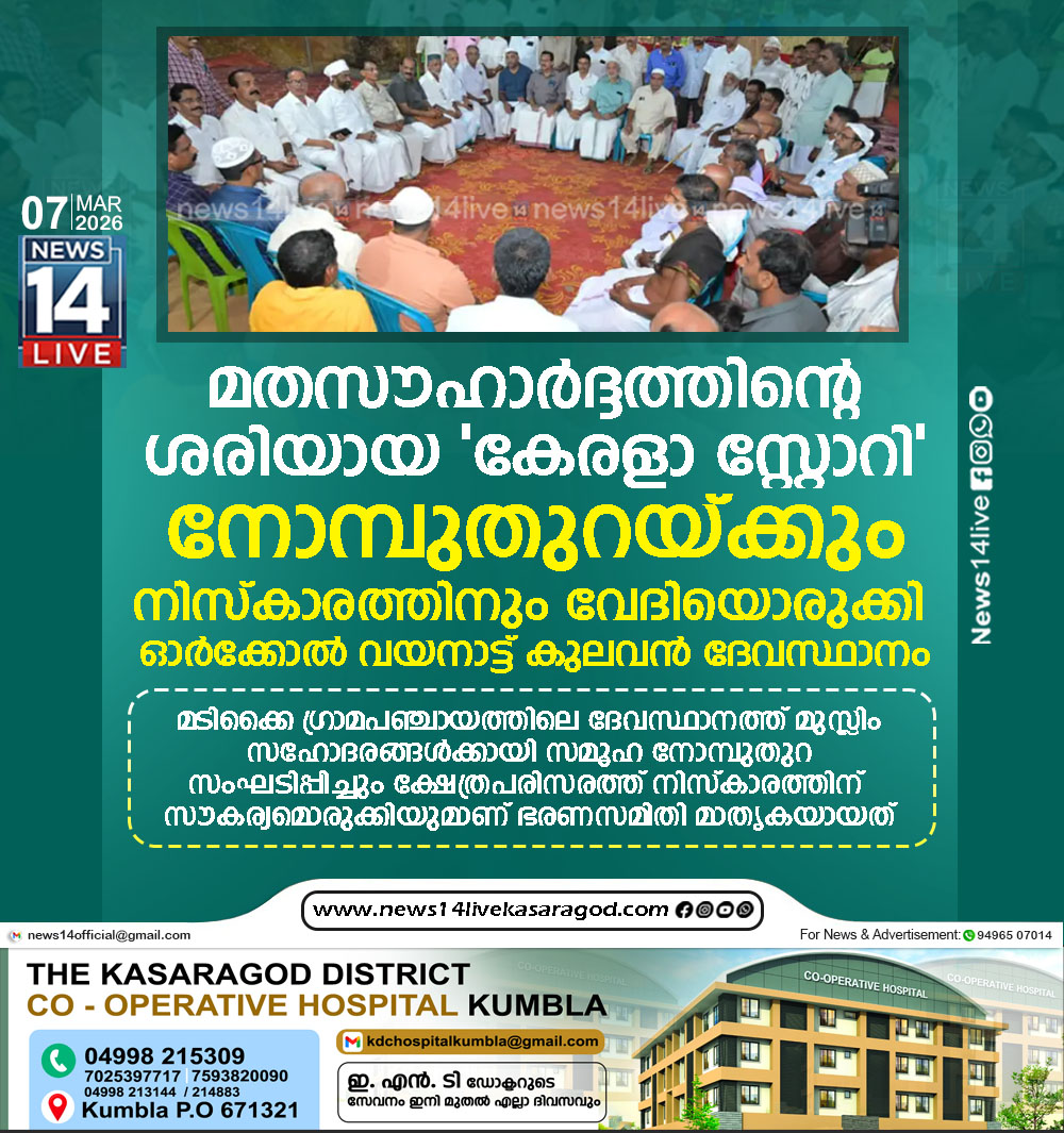 മതസൗഹാര്ദ്ദത്തിന്റെ ഉജ്ജ്വലമായ മാതൃകയൊരുക്കി കാസര്കോട് ജില്ലയിലെ ഓര്ക്കോല് മീത്തലെപ്പുര വയനാട്ട് കുലവന് ദേവസ്ഥാനം. മടിക്കൈ ഗ്രാമപഞ്ചായത്തിലെ ദേവസ്ഥാനത്ത് മുസ്ലിം സഹോദരങ്ങള്ക്കായി സമൂഹ നോമ്പുതുറ സംഘടിപ്പിച്ചും ക്ഷേത്രപരിസരത്ത് നിസ്കാരത്തിന്…