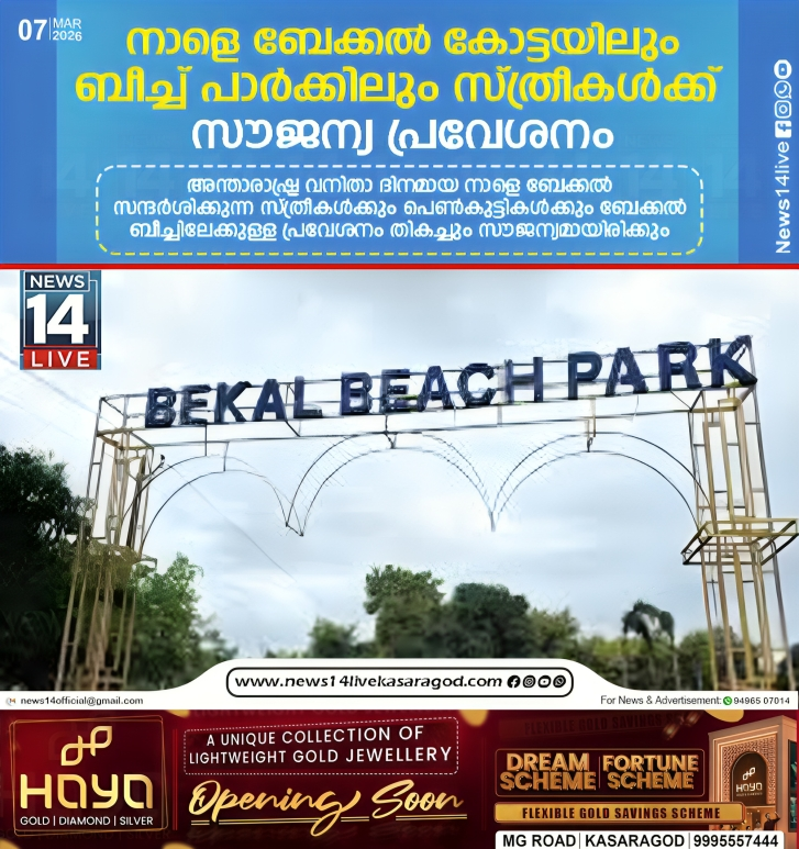 അന്താരാഷ്ട്ര വനിതാ ദിനമായ നാളെ ബേക്കല് സന്ദര്ശിക്കുന്ന സ്ത്രീകള്ക്കും പെണ്കുട്ടികള്ക്കും ബേക്കല് ബീച്ചിലേക്കുള്ള പ്രവേശനം തികച്ചും സൗജന്യമായിരിക്കും. ടിക്കറ്റ് ഇളവുകള് കൂടാതെ അന്നേ ദിവസം ബീച്ച് പാര്ക്കില്…