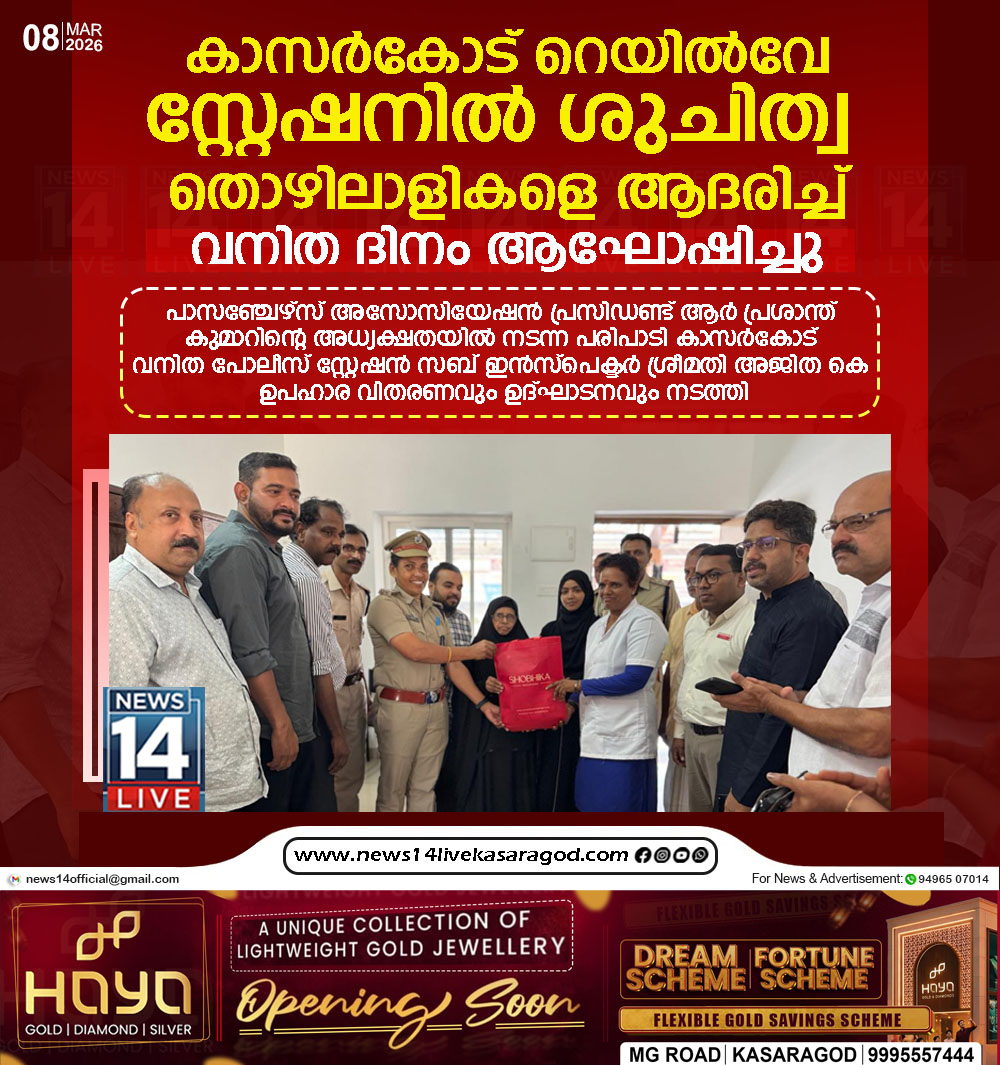 കാസറഗോഡ് : മാര്ച്ച് 8 സാര്വ്വ ദേശീയ വനിതാ ദിനത്തില്, കാസര്ഗോഡ് റെയില്വേ സ്റ്റേഷന് റെയില്മൈത്രി പോലീസും കാസറഗോഡ് റെയില്വേ പാസഞ്ചേഴ്സ് അസോസിയേഷനും സംയുക്തമായി സ്റ്റേഷനിലെ ശുചിത്വ…