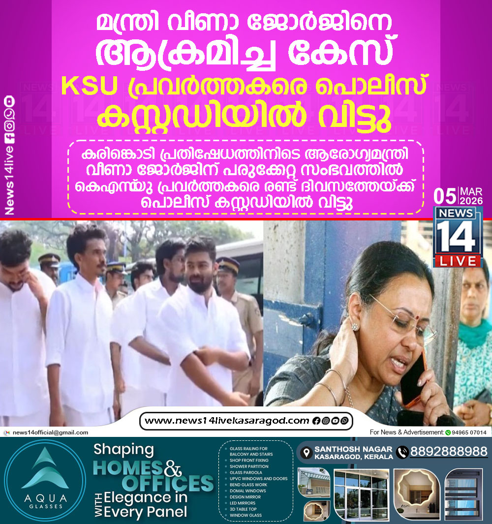 കരിങ്കൊടി പ്രതിഷേധത്തിനിടെ ആരോഗ്യമന്ത്രി വീണാ ജോര്ജിന് പരുക്കേറ്റ സംഭവത്തില് കെഎസ്യു പ്രവര്ത്തകരെ രണ്ട് ദിവസത്തേയ്ക്ക് പൊലീസ് കസ്റ്റഡിയില് വിട്ടു. നാളെ വൈകിട്ട് 4 മണി വരെയാണ് കണ്ണൂര്…