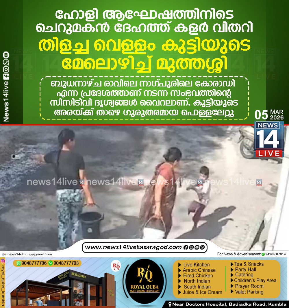 നാഗ്പൂര്: ഹോളി ആഘോഷത്തിനിടെ കളിച്ചുകൊണ്ട് തന്റെ മേല് കളര് വിതറിയ കൊച്ചുമകന്റെ ശരീരത്തിലേക്ക് മുത്തശ്ശി തിളച്ചവെള്ളമൊഴിച്ചു. ബുധനാഴ്ച രാവിലെ നാഗ്പൂരിലെ കോരാഡി എന്ന പ്രദേശത്താണ് നടന്ന സംഭവത്തിന്റെ…