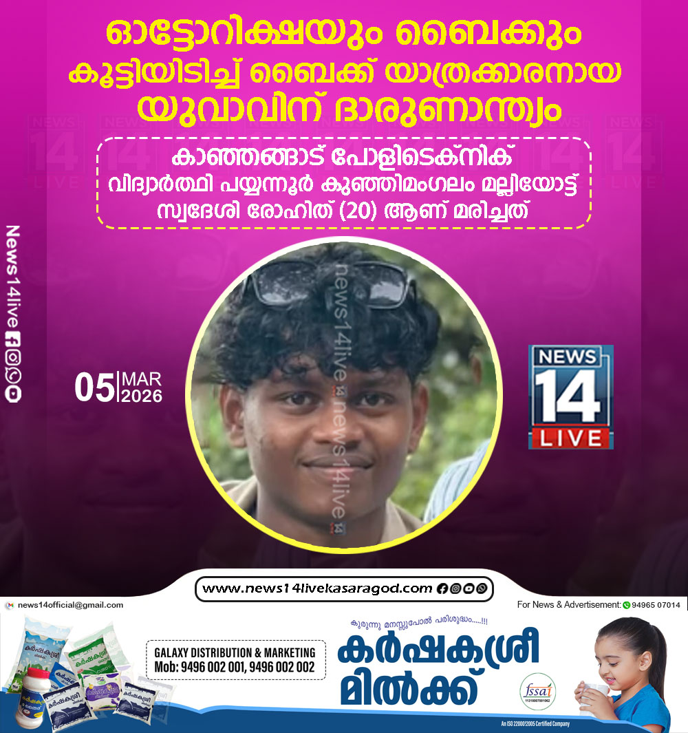 കാഞ്ഞങ്ങാട് പോളിടെക്നിക് വിദ്യാര്ത്ഥി പയ്യന്നൂര് കുഞ്ഞിമംഗലം മല്ലിയോട്ട് സ്വദേശി രോഹിത് (20) ആണ് മരിച്ചത് മരിച്ചത്