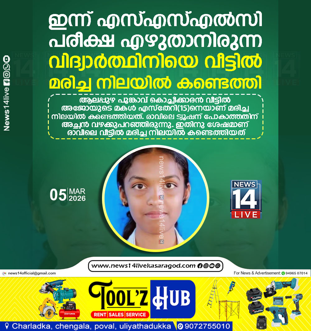 ആലപ്പുഴ: ആലപ്പുഴയില് വിദ്യാര്ത്ഥിനിയെ തൂങ്ങി മരിച്ച നിലയില് കണ്ടെത്തി. ആലപ്പുഴ പൂങ്കാവ് കൊച്ചീക്കാരന് വീട്ടില് അജോയുടെ മകള് എസ്തേറി(15)നെയാണ് മരിച്ച നിലയില് കണ്ടെത്തിയത്. രാവിലെ ട്യൂഷന് പോകാത്തതിന്…