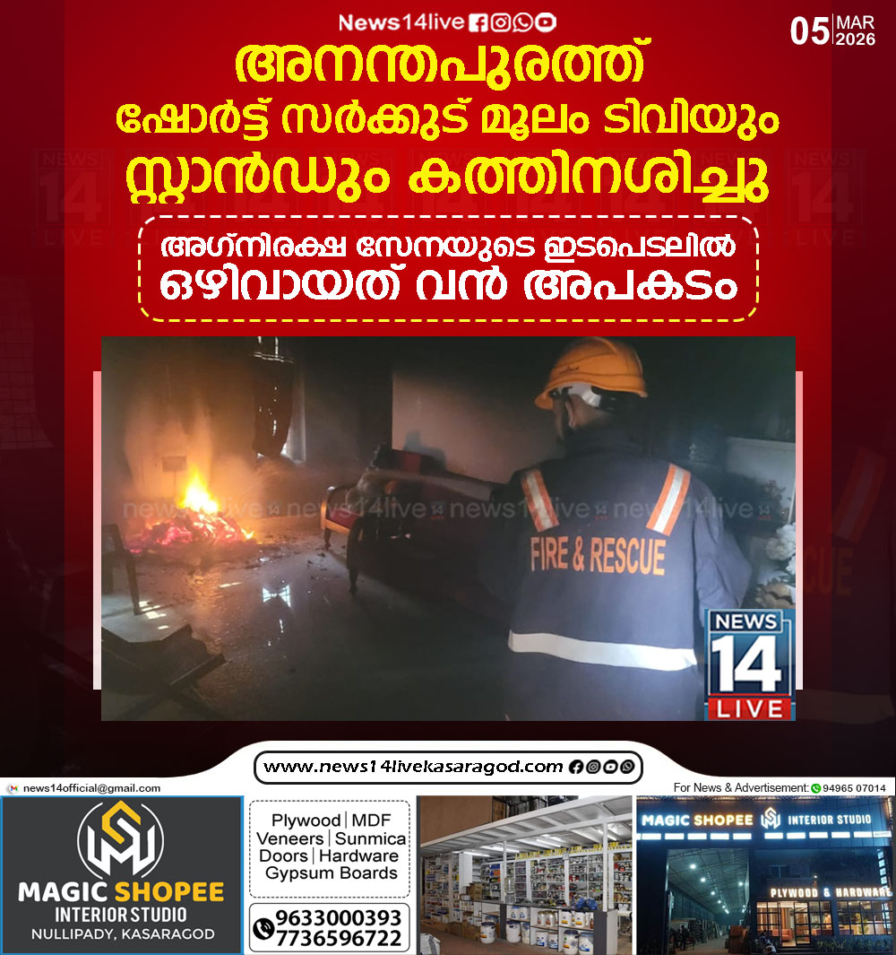 കാസര്കോട്: അനന്തപുരത്തു രാജാറം എന്നയാളുടെ വീട്ടിലാണ് ടിവി യും സ്റ്റാന്ഡും ഷോര്ട്ട് circuit മൂലം പൂര്ണമായും കത്തി നശിച്ചത്. ഹാളില് നിന്നും ശക്തമായ തീയും പുകയും ഉയരുന്നത്…