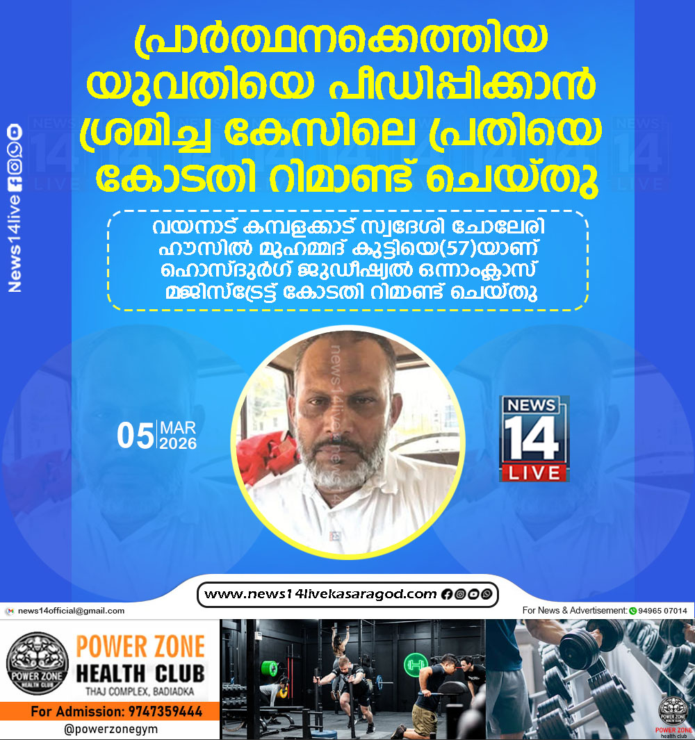 കാഞ്ഞങ്ങാട്: പ്രാർത്ഥനക്കെത്തിയ യുവതിയെ പീഡിപ്പിക്കാൻ ശ്രമിച്ച കേസിലെ പ്രതിയെ കോടതി റിമാന്റ് ചെയ്തു. വയനാട് കമ്പളക്കാട് സ്വദേശി മുഹമ്മദ് കുട്ടിയെ(57)യാണ് ഹൊസ്ദുർഗ് ജുഡീഷ്യൽ ഒന്നാംക്ലാസ് മജിസ്ട്രേട്ട് കോടതി…